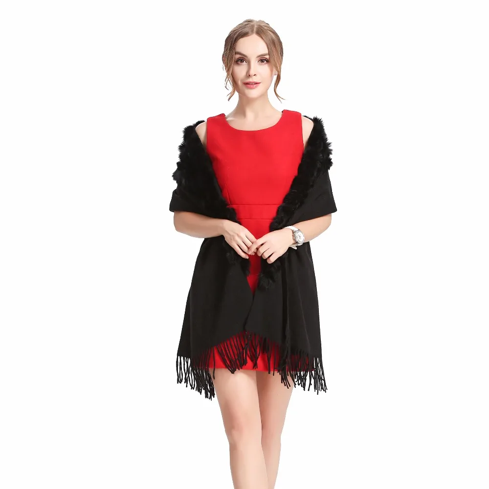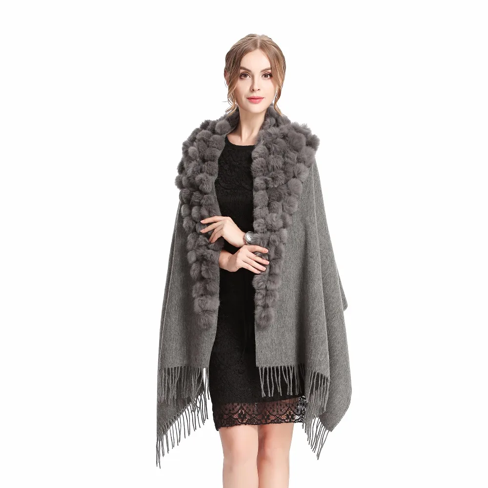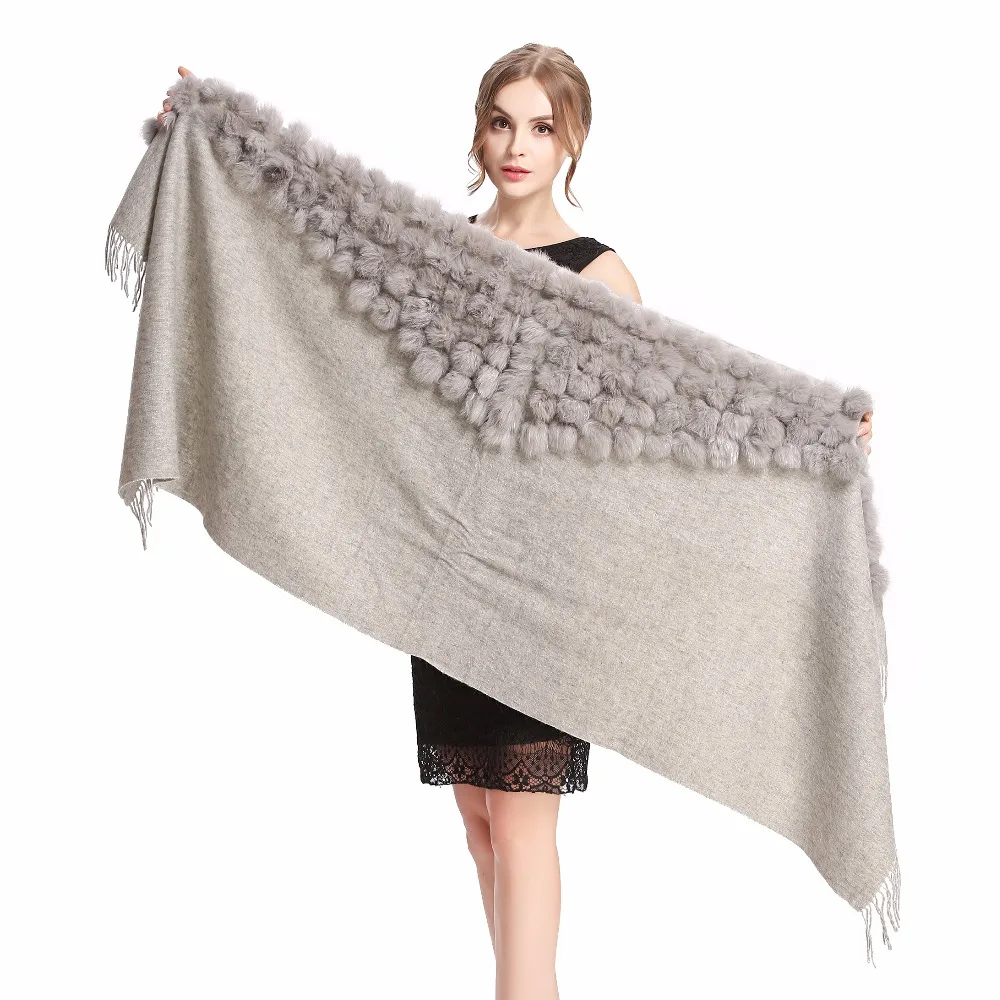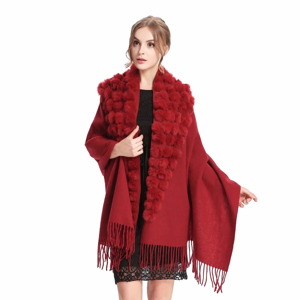 Flash Sale ZY87001-1 Classic Womens Woolen Shawls with Rabbit Fur pompoms Tassels Decoration Fashion Lady Soli