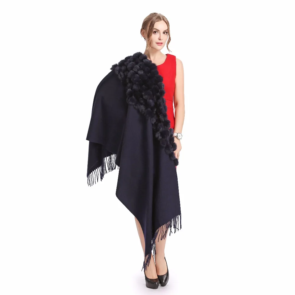 Mega Discount ZY87001-1 Classic Womens Woolen Shawls with Rabbit Fur pompoms Tassels Decoration Fashion Lady Soli